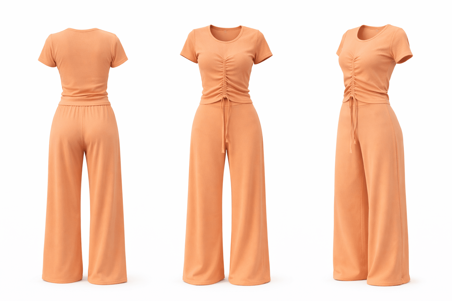 Variegated rib fabric with a top featuring a drawstring cinched detail and cap sleeves, paired with matching wide-leg pants for a textured, effortless look.